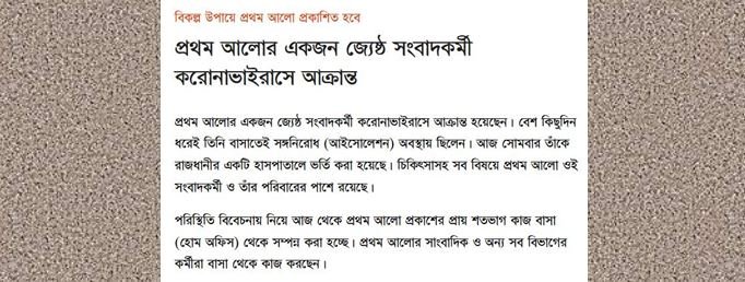 সোমবার দুপুর ২ ৩৯ মিনিটে প্রকাশিত প্রথম আলোর অনলাইন ভার্সনে জানানো হয়, ‘প্রথম আলোর একজন জ্যেষ্ঠ সংবাদকর্মী করোনাভাইরাসে আক্রান্ত হয়েছেন। বেশ কিছুদিন ধরেই তিনি বাসাতেই সঙ্গনিরোধ (আইসোলেশন) অবস্থায় ছিলেন। আজ সোমবার তাঁকে রাজধানীর একটি হাসপাতালে ভর্তি করা হয়েছে। চিকিৎসাসহ সব বিষয়ে প্রথম আলো ওই সংবাদকর্মী ও তাঁর পরিবারের পাশে রয়েছে।
