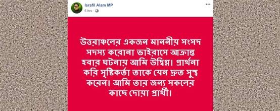 শুক্রবার রাতে নওগাঁ-৬ আসনের সংসদ সদস্য ইস্রাফিল আলম ফেসবুকে দেয়া স্ট্যাটাসে বলেন, “উত্তরাঞ্চলের একজন মাননীয় সংসদ সদস্য করোনা ভাইরাসে আক্রান্ত হবার ঘটনায় আমি উদ্বিগ্ন। প্রার্থনা করি সৃষ্টিকর্তা তাকে যেন দ্রুত সুস্থ করেন। আমি তার জন্য সকলের কাছে দোয়া প্রার্থী।”