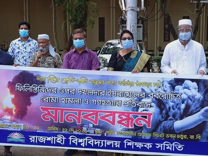 ২২ মে ২০২১ (নিউজ ডেস্ক, রাজশাহী বিশ্ববিদ্যালয়): ফিলিস্তিনের বেসামরিক জনগণের ওপর ইসরায়েলি বাহিনীর হামলা ও হত্যাযজ্ঞকে মানবতার বিরুদ্ধে অপরাধ হিসেবে অভিহিত করেছে রাজশাহী বিশ্ববিদ্যালয় শিক্ষক সমিতি। ইসরায়েলের বিরুদ্ধে আন্তর্জাতিক অপরাধ আদালতে বিচারের দাবিও জানিয়েছেন শিক্ষক সমিতি নেতারা।