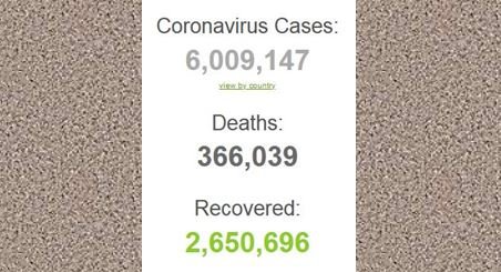 শনিবার ভোরে ওয়ার্ল্ডোমিটারের সবশেষ তথ্য অনুযায়ী, এ পর্যন্ত মরণঘাতি করোনা ভাইরাসে আক্রান্ত হয়েছেন ৬০ লাখ ৯ হাজার ১৪৭ জন। মোট মারা গেছেন ৩ লাখ ৬৬ হাজার ৩৯ জন। এছাড়া সুস্থ হয়েছেন ২৬ লাখ ৫০ হাজার ৬৯৬ জন।