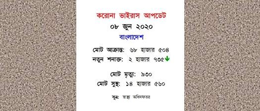 দেশে করোনা আক্রান্তের সংখ্যা ৬৮ হাজার ছাড়িয়েছে। বর্তমানে দেশে এ ভাইরাসে আক্রান্ত ৬৮ হাজার ৫০৪ জন রোগী রয়েছেন। গত ২৪ ঘন্টায় ২ হাজার ৭৩৫ জনের দেহে করোনা ভাইরাস শনাক্ত হয়েছে।