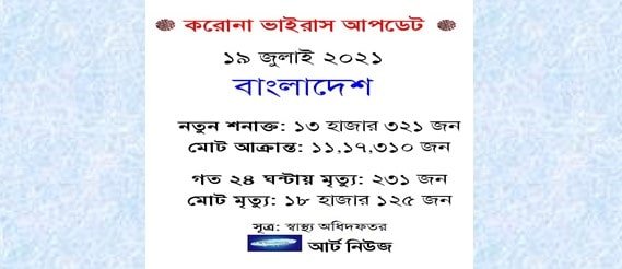১৯ জুলাই ২০২১ (নিউজ ডেস্ক): দেশে করোনা ভাইরাসে মৃত্যুর নতুন রেকর্ড হয়েছে। মৃতের সংখ্যা ছাড়িয়েছে ১৮ হাজার। গত ২৪ ঘন্টায় মারা গেছেন আরও ২৩১ জন। এ পর্যন্ত দেশে করোনা অতিমারিতে ১৮ হাজার ১২৫ জন মানুষ মারা গেছেন।