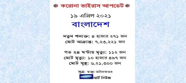 বিজ্ঞপ্তিতে আরও জানানো হয়, গত ২৪ ঘন্টায় ২৪ হাজার ১৫২ জনের নমুনা পরীক্ষা করা হয়েছে। এর মধ্যে কোভিড-১৯ রোগী শনাক্ত হয়েছেন ৪ হাজার ২৭১ জন। গতকালের চেয়ে আজ ৫৭৩ জন বেশি শনাক্ত হয়েছেন। গতকাল ১৯ হাজার ৪০৪ জনের নমুনা পরীক্ষায় ৩ হাজার ৬৯৮ জনের শরীরে করোনা শনাক্ত হয়েছিল।