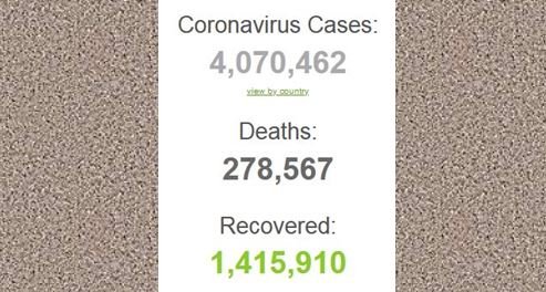 শনিবার ওয়ার্ল্ডোমিটার জানিয়েছে, এ পর্যন্ত মরণঘাতি করোনা ভাইরাসে আক্রান্ত হয়েছেন ৪০ লাখ ৭০ হাজার ৪৬২ জন। মোট মারা গেছেন ২ লাখ ৭৮ হাজার ৫৬৭ জন। এছাড়া সুস্থ হয়েছেন ১৪ লাখ ১৫ হাজার ৯১০ জন।