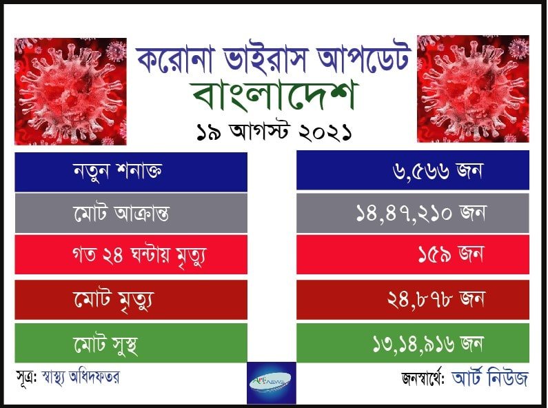 ১৯ আগস্ট ২০২১ (নিউজ ডেস্ক): গত ২৪ ঘন্টায় করোনা ভাইরাসে আক্রান্ত হয়ে মারা গেছেন আরও ১৫৯ জন। দেশে এ পর্যন্ত ২৪ হাজার ৮৭৮ জন মারা গেছেন।