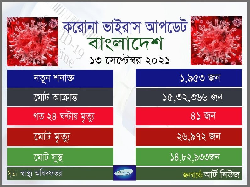 ১৩ সেপ্টেম্বর ২০২১ (নিউজ ডেস্ক): দেশে করোনা ভাইরাসে গত ২৪ ঘন্টায় মারা গেছেন আরও ৪১ জন। দেশে এ পর্যন্ত ২৬ হাজার ৯৭২ জন মারা গেছেন।