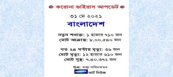 ৩১ মে ২০২১ (নিউজ ডেস্ক): গত ২৪ ঘন্টায় দেশে করোনা ভাইরাসে মারা গেছেন ৩৬ জন। দেশে এখন পর্যন্ত এ ভাইরাসে…