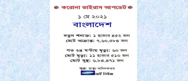 ১ মে ২০২১ (নিউজ ডেস্ক): গত ২৪ ঘন্টায় দেশে করোনা ভাইরাসে মারা গেছেন ৬০ জন। এদের মধ্যে ৩৭ জন পুরুষ…