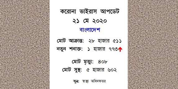 গত ২৪ ঘন্টায় দেশে ১ হাজার ৭৭৩ জনের দেহে করোনা ভাইরাস শনাক্ত হয়েছে। এটি একদিনে সর্বোচ্চ শনাক্তের রেকর্ড। এ সময়ে…