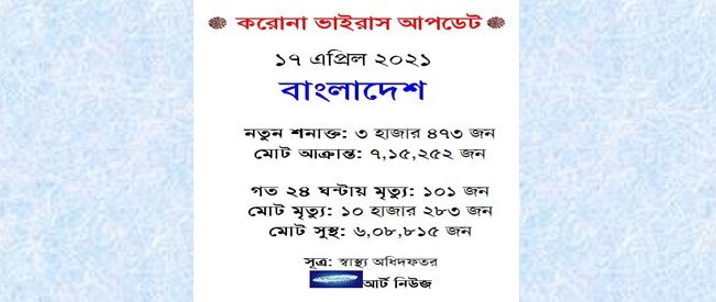 ১৭ এপ্রিল ২০২১ (নিউজ ডেস্ক): দেশে করোনায় একদিনে মৃতের সংখ্যা তিন অংকের ঘরে পৌঁছছে গতকাল। গত ২৪ ঘন্টায় দেশে করোনায়…