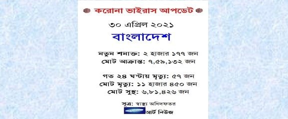 ৩০ এপ্রিল ২০২১ (নিউজ ডেস্ক): গত ২৪ ঘন্টায় দেশে করোনা ভাইরাসে মারা গেছেন ৫৭ জন। এদের মধ্যে ৩২ জন পুরুষ…