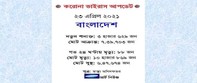 ২৩ এপ্রিল ২০২১ (নিউজ ডেস্ক): গত ২৪ ঘন্টায় দেশে করোনা ভাইরাসে মারা গেছেন আরও ৮৮ জন। দেশে এখন পর্যন্ত এ…