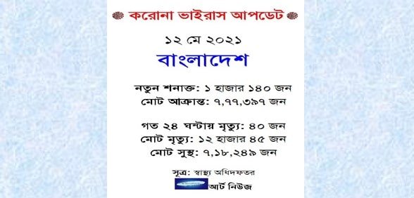 ১২ মে ২০২১ (নিউজ ডেস্ক): গত ২৪ ঘন্টায় দেশে করোনা ভাইরাসে মারা গেছেন ৪০ জন। গতকালের চেয়ে আজ ৭ জন…