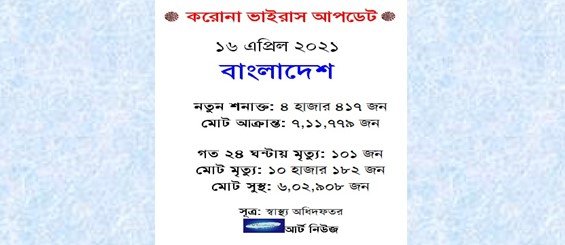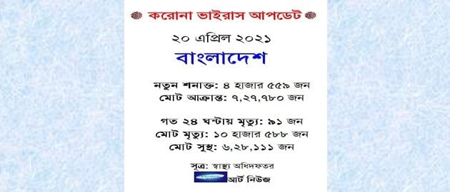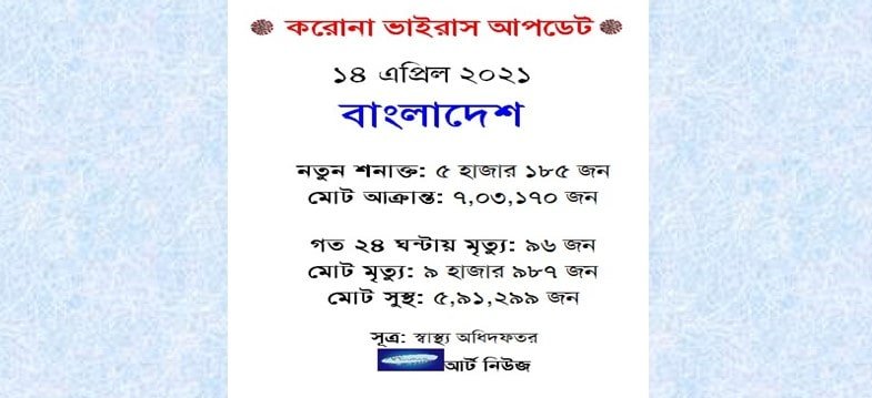 ১৪ এপ্রিল ২০২১ (নিউজ ডেস্ক): গত ২৪ ঘন্টায় দেশে করোনায় আরও ৯৬ জন মারা গেছেন। গতকালের চেয়ে আজ ২৭ জন…