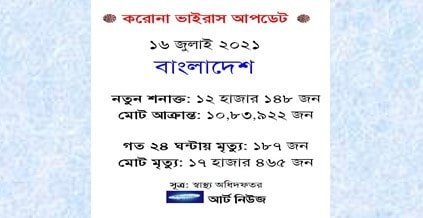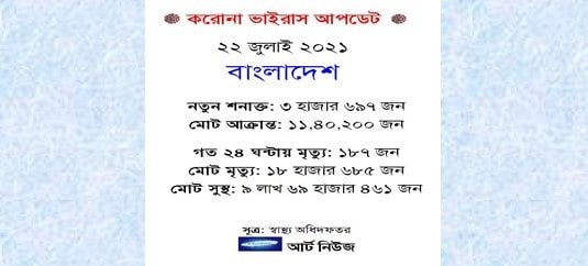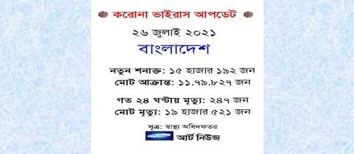 ২৪ জুলাই ২০২১ (নিউজ ডেস্ক): করোনা ভাইরাসে দেশে মৃতের সংখ্যা ১৯ হাজার ছাড়িয়েছে। মরণঘাতি এই ভাইরাসে গত ২৪ ঘন্টায় মারা…