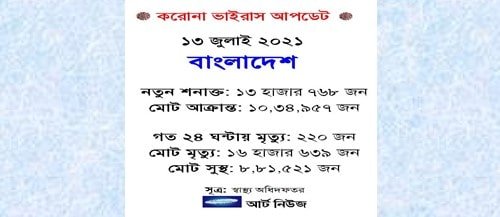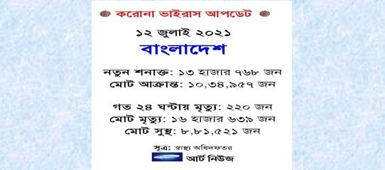 ১২ জুলাই ২০২১ (নিউজ ডেস্ক): দেশে করোনা ভাইরাসে গত ২৪ ঘন্টায় আরও ২২০ জন মারা গেছেন। নতুন করে শনাক্ত হয়েছেন…