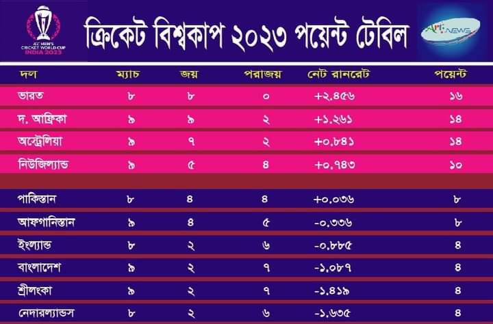 বিশ্বকাপের সবশেষ পয়েন্ট টেবিল
